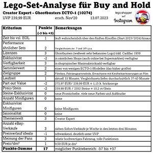 Das Lego-Set selbst kommt bei den Fans sehr gut an. So ist das Set ein solider Bau mit tollen Funktionen. Die Rost-Sticker sehen viele als optional und freuen sich über die Möglichkeit, diese weglassen zu können. Viele andere Teile sind bedruckt. Minifiguren sind keine dabei. Diese würden zwar vom Maßstab auch nicht passen, fehlen aber dennoch im Vergleich mit den vorherigen ECTO-1-Modellen. Bei den Einzelsteinen ist die exklusive Frontscheibe des Fahrzeugs zu erwähnen. Viele andere Steine kommen in einer neuen Farbe bzw. mit neuem Aufdruck. Durch Legos Preiserhöhung von 199,99 EUR auf 239,99 EUR fallen die Punkte für den Part out Value und den Preis je Stein mager aus. Kauft dieses Set aber bitte nicht zur UVP! Im Handel gibt es relativ hohe Rabatte und so relativieren sich einige Nachteile des Sets auch wieder. In meiner Analyse (wie immer ohne Berücksichtigung aktueller Rabatte gerechnet) erreicht das Set vergleichbare 17 Punkte.