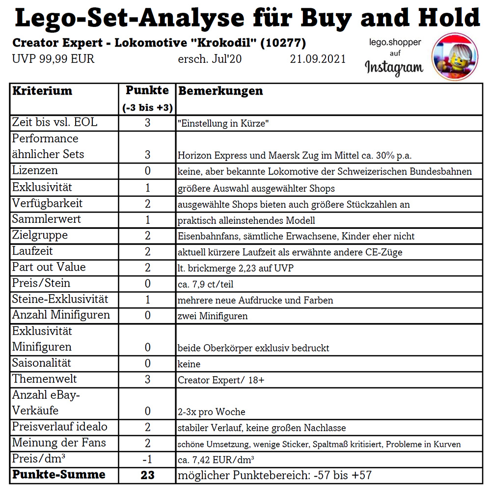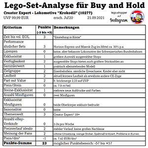 Es folgt meine Analyse zu einem Lego-Set für eine Buy and Hold-Strategie. Gerne erhalte ich Feedback dazu. Wie sich die Gesamtbewertung ergibt, kann der abgebildeten Tabelle entnommen werden. Im Folgenden umschreibe ich die wichtigsten Punkte in Textform.