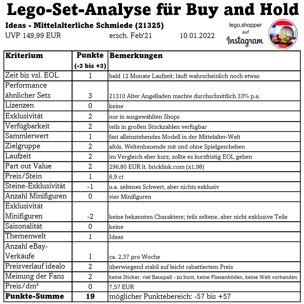 Es folgt meine Analyse zu einem Lego-Set für eine Buy and Hold-Strategie. Gerne erhalte ich Feedback dazu. Wie sich die Gesamtbewertung ergibt, kann der abgebildeten Tabelle entnommen werden. Im Folgenden umschreibe ich die wichtigsten Punkte in Textform.