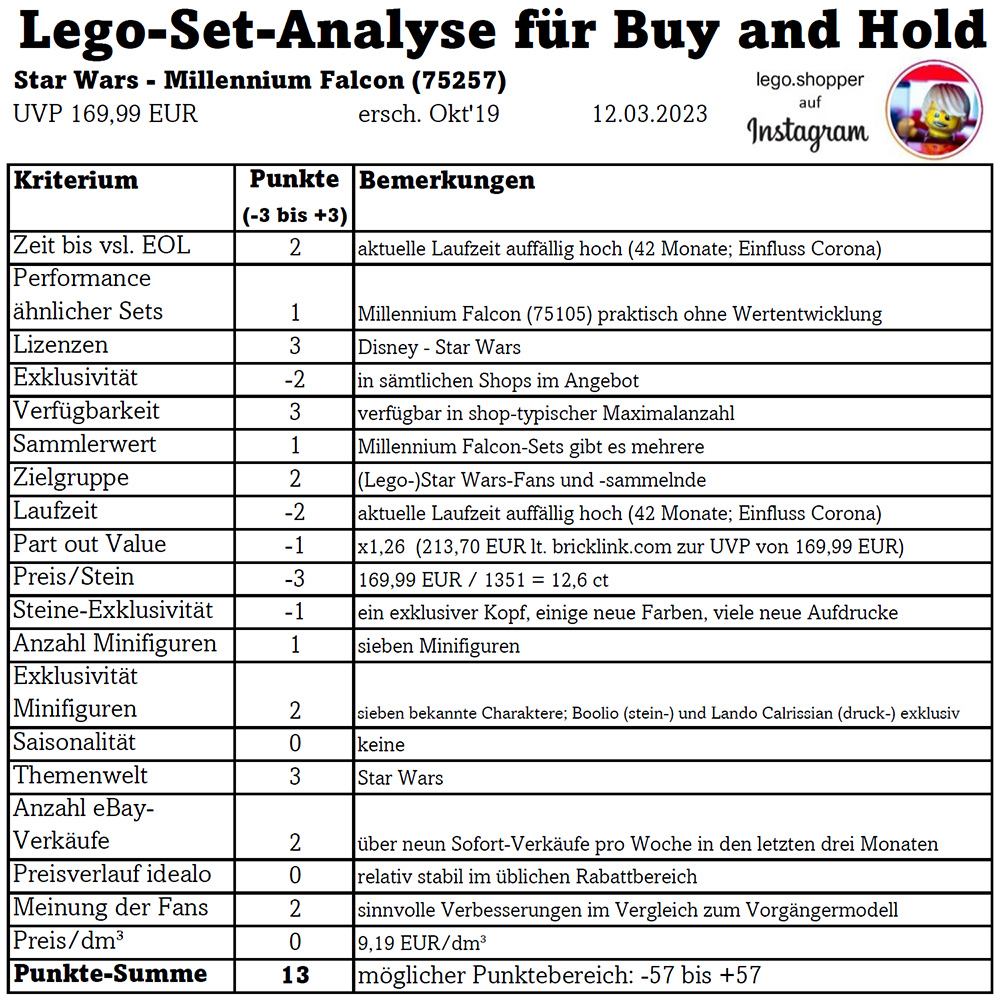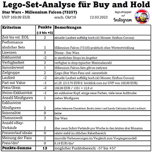 Es folgt meine Analyse zu einem Lego-Set für eine Buy and Hold-Strategie. Gerne erhalte ich Feedback dazu. Wie sich die Gesamtbewertung ergibt, kann der abgebildeten Tabelle entnommen werden. Im Folgenden umschreibe ich die wichtigsten Punkte in Textform.