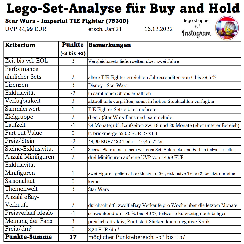 Es folgt meine Analyse zu einem Lego-Set für eine Buy and Hold-Strategie. Gerne erhalte ich Feedback dazu. Wie sich die Gesamtbewertung ergibt, kann der abgebildeten Tabelle entnommen werden. Im Folgenden umschreibe ich die wichtigsten Punkte in Textform.